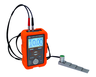 The portable ultrasonic thickness gauge UT-1M, for operative non-destructive testing of the thickness, works on the principle of ultrasounds’ propagation time measurement in the analysed material. The pulsations generator produces high frequency electrical pulses which agitate the probe. It converts the electrical signals into elastic (mechanical) vibrations – sound waves. These waves spread from the input surface to the reflective surface (bottom) and, once turned back, they are collected and converted into the electrical signal via PET. After that the device calculates the thickness of the tested object.