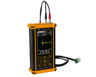 Lo spessimetro a ultrasuoni UT-1M, per prove operative non distruttive dello spessore, opera sul principio della misurazione del tempo di propagazione degli ultrasuoni nel materiale testato. Il generatore di pulsazioni produce pulsazioni elettriche ad alta frequenza che agitano la sonda. Questa converte i segnali elettrici in vibrazioni elastiche meccaniche (onde suono). Queste onde si propagano dalla superficie di input alla superficie riflettente (fondo) e, tornate indietro, vengono riprese e convertite nel segnale elettrico mediante PET. Il dispositivo calcola così lo spessore dell’oggetto misurato.